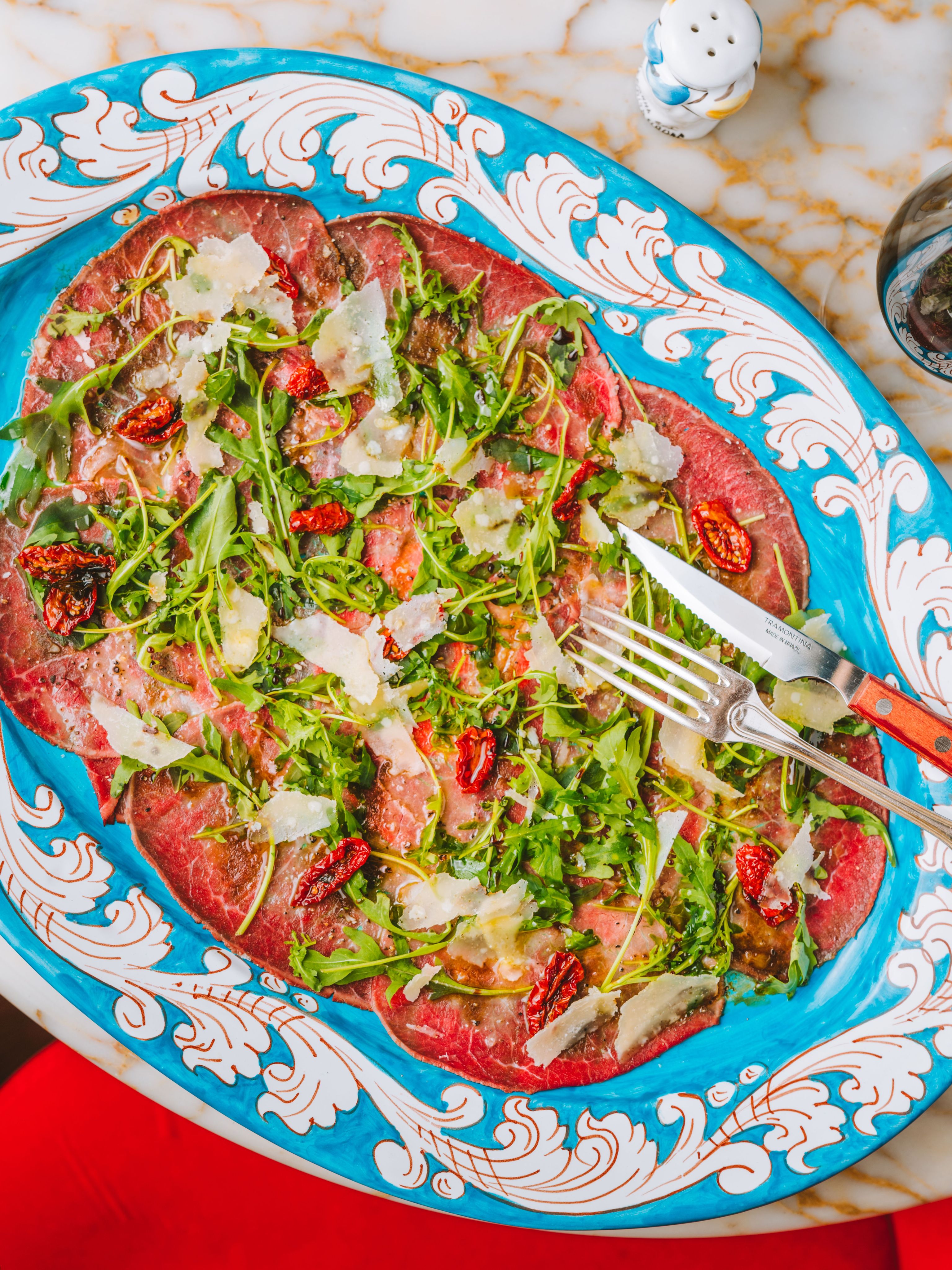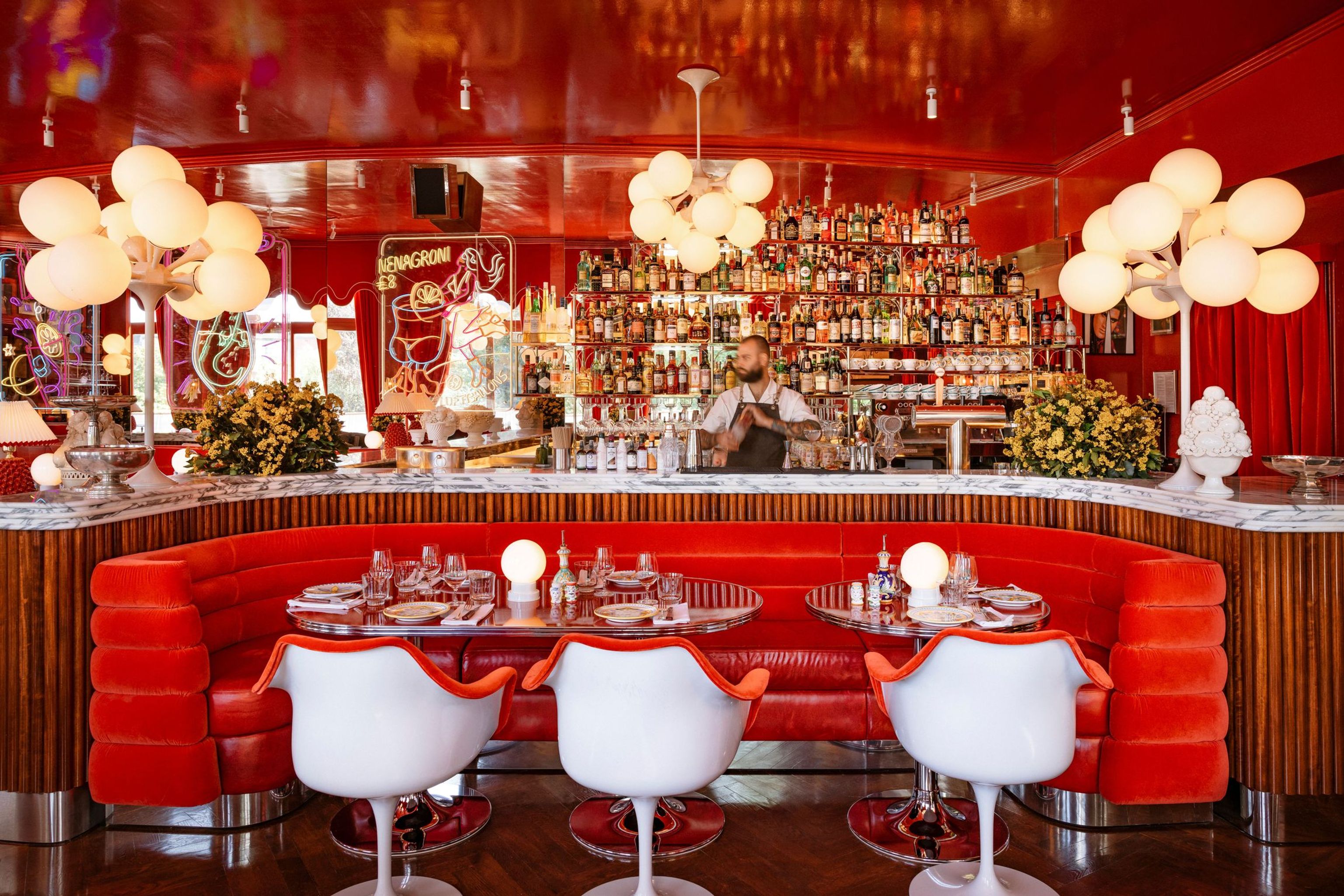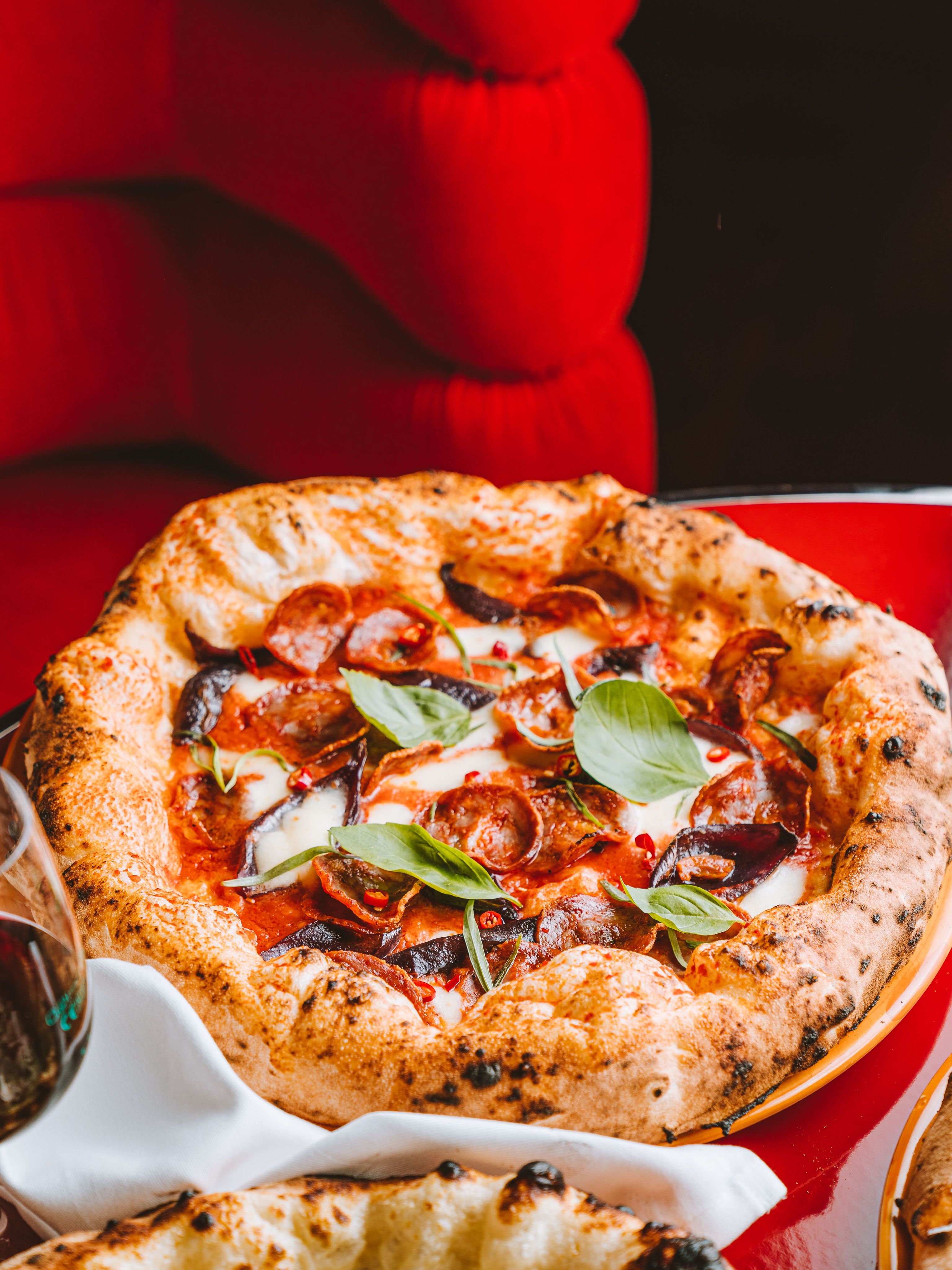 Experience Dolce Vita at Coccodrillo – Authentic Italian Cuisine in the Heart of the City. Stroll directly from the picturesque Weinbergspark into our Italian Riviera and immerse yourself in the charm of 1960s Northern Italy, with a touch of Space Age flair. Our seductive trattoria features red velvet-upholstered banquettes and walls painted in bold red, adorned with vintage Fiorucci posters. The interior opens up to a round terrace with large sunshades – the perfect spot to enjoy Dolce Vita. Discover authentic Italian cuisine, homemade pasta, and Neapolitan pizza at Coccodrillo!